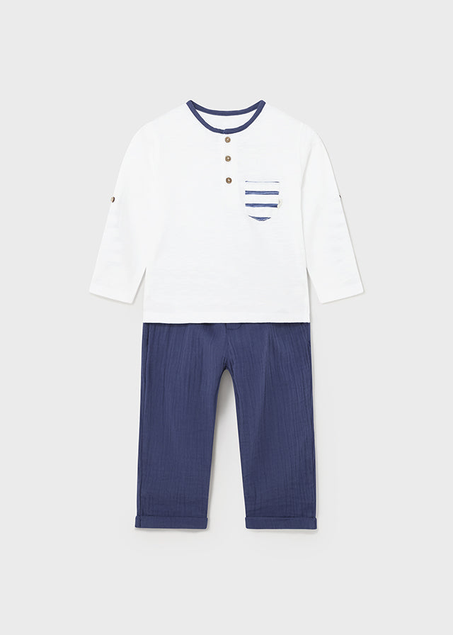 "Rendi il tuo bambino ancora più coccolato con il completo 2 pezzi di cotone! Morbido e confortevole, composto da una maglia con maniche lunghe e un pantalone lungo, il tuo piccolo sarà alla moda e al caldo. Perfetto per ogni occasione, è pensato per garantire il massimo comfort e stile al tuo bambino!"