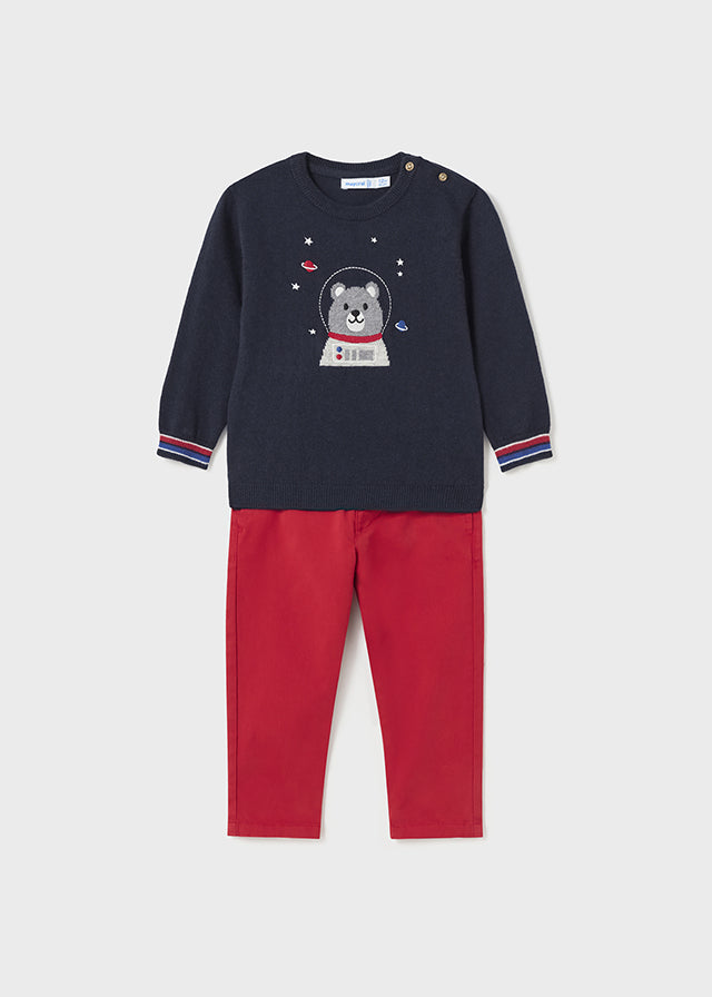 I bambini saranno pronti ad affrontare qualsiasi avventura con questo comodo completo 2 pezzi che comprende maglione e pantaloni baby maschio. Realizzato con tessuti di qualità e cura per i dettagli, garantisce traspirabilità, resistenza e comodità.