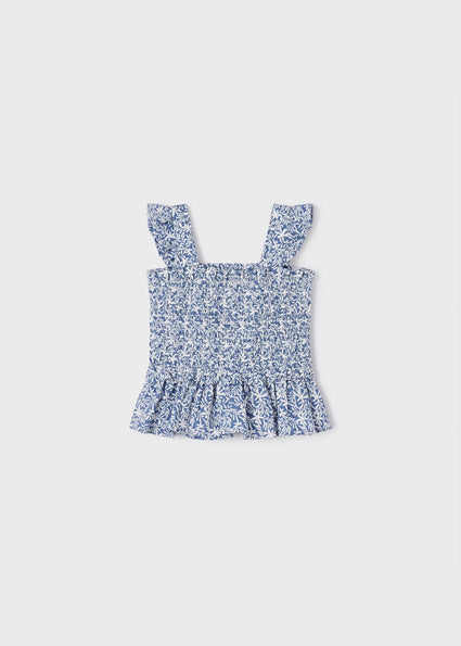 Blusa con bretelle per bambina. Colletto retto. Tessuto 100% cotone. Design stampato.