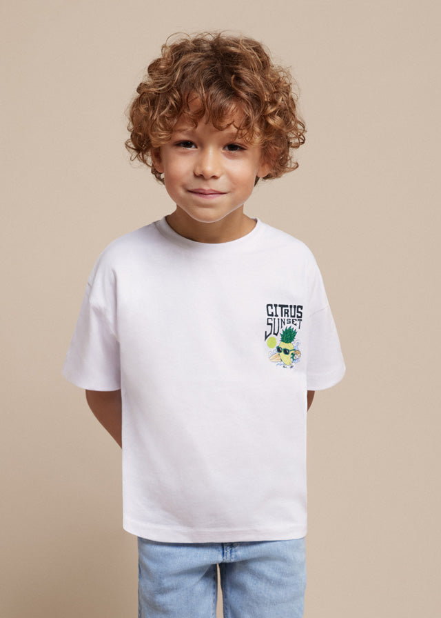 "Crea uno stile unico per il tuo bambino con questa maglietta in cotone di alta qualità! La stampa posteriore aggiunge un tocco di personalità e divertimento, mentre il tessuto morbido garantisce confort durante tutto il giorno."