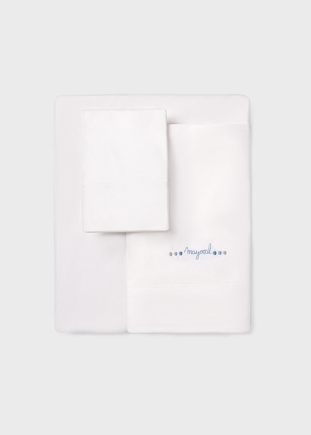 Set completo di lenzuola per culla Mayoral, che include coprimaterasso, lenzuolino e federa per cuscino, ideale per culla e carrozzina. Scegli tra due dolci varianti di colore, rosa o celeste, perfette per accogliere con stile e comfort il tuo neonato o neonata.