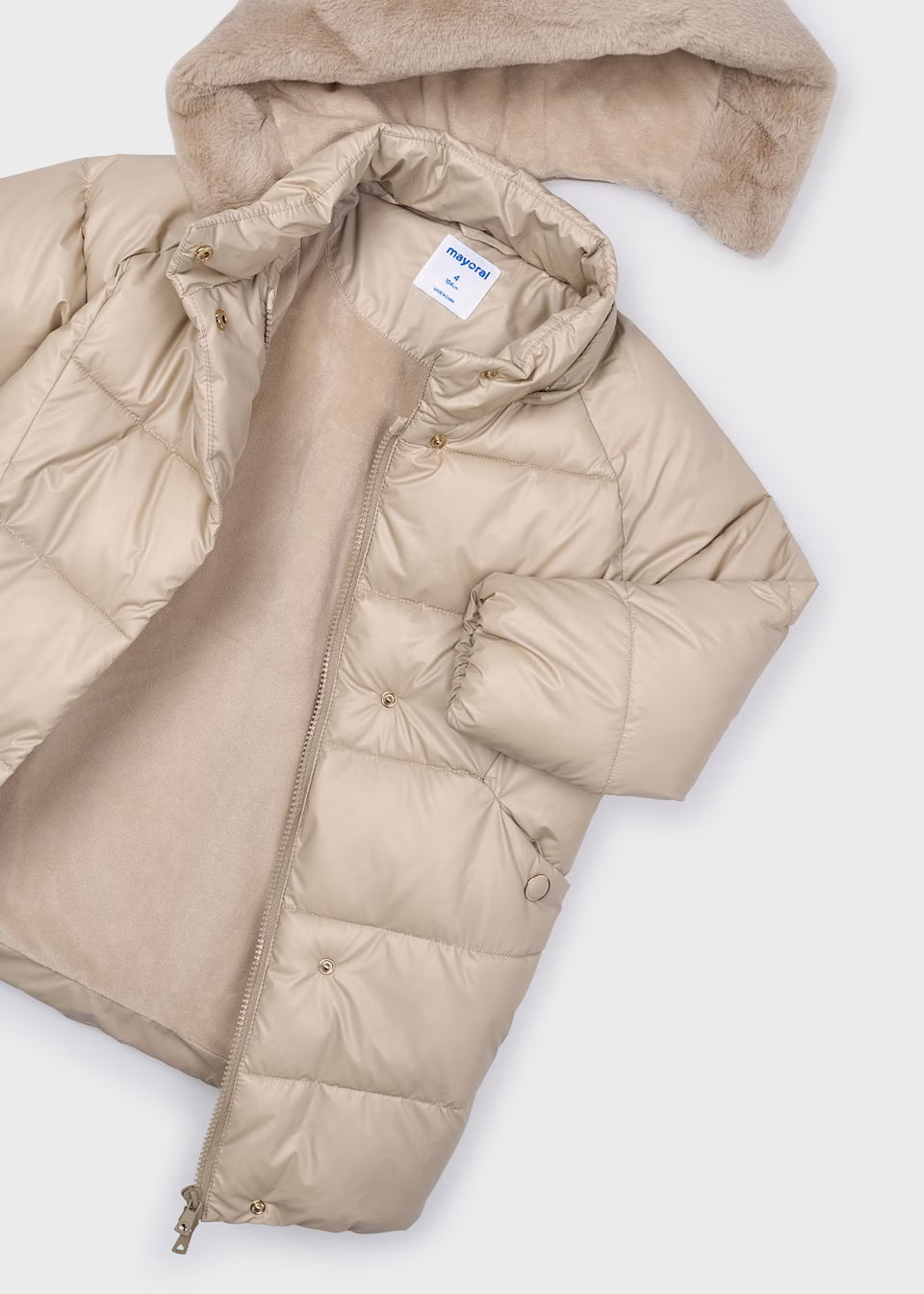 GiacconeContiene poliestere riciclato. Giaccone manica lunga per bambina con polsini elasticizzati. Cappuccio rimovibile con dettagli in pellicciotto. Design con taglio lungo. Chiusura con bottoni nella parte anteriore. Chiusura centrale con cerniera. Esterno in tessuto con effetto imbottito. Morbida fodera interna in poliestere.