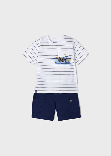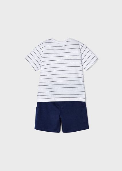 Capo ECOFRIENDS contiene cotone organico. Pantalone corto modello bermuda per bambino. Vita elasticizzata con cordoncino regolabile. Tasche laterali.