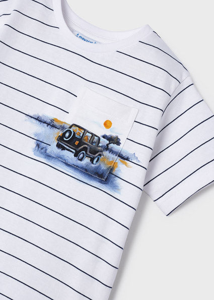 Capo ECOFRIENDS 100% cotone sostenibile Maglietta manica corta per bambino. Girocollo. Tasca funzionale nella parte anteriore. Trama a righe.