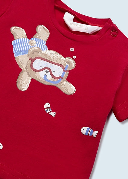 Maglietta manica corta per neonato. Girocollo. Chiusura con bottoni a pressione sulla spalla che facilitano la vestibilità del capo. Morbido tessuto di cotone elasticizzato. Elementi decorativi: disegno nella parte anteriore