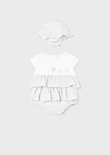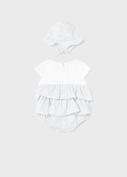 Pagliaccetto manica corta per neonato. Chiusura con bottoni a pressione nell'interno cosce per agevolare la vestibilità. Apertura posteriore con cerniera invisibile. Elementi decorativi: volant decorativi